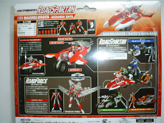 The Machslugger features a number of detachable parts - two blades, two ''wings,'' a canopy and a tail piece. Each piece features a number of different ports/mounts and can be reattached to the core vehicle (and even to Microman Kaito) to produce different configurations. The pieces are also reconfigured when you assemble the four Road Spartans into their ''combiner'' vehicle (although I've yet to attempt that...)
